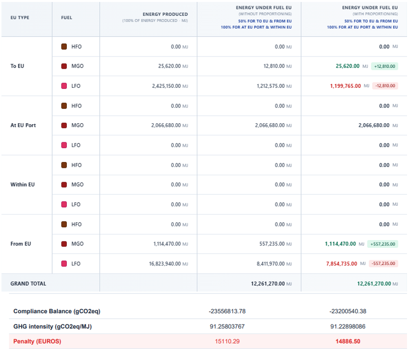 This involves getting your vessel data pre-verified and all your annual compliance balance and penalties evaluated. For Fuel EU the total annual compliance is not merely the sum of the individual compliance balances associated with various voyages, but is more complex considering the provisions of Fuel proportioning given under the regulation. The differences are illustrated with the extract of the figures for the same vessel